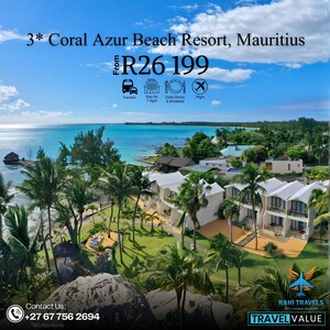 This travel package features a 3-star stay at Coral Azur Beach Resort, Mauritius, starting from R26,199. The offer includes airport transfers, a 7-night hotel stay, daily dinner and breakfast, and flights. Designed for travelers seeking a complete and well-organized holiday experience, this package is presented by Rahi Travels under their Travel Value range.