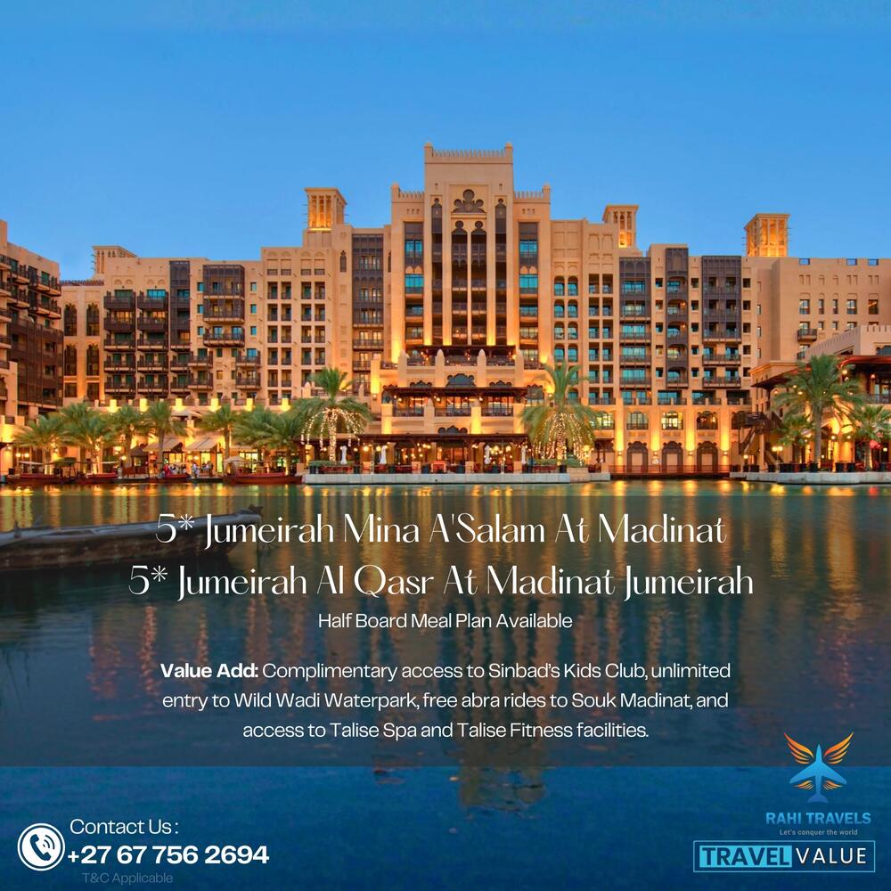 This combined package offers a stay at Jumeirah Mina A’Salam and Jumeirah Al Qasr, both 5-star beachfront resorts located within the renowned Madinat Jumeirah complex in Dubai. Reflecting traditional Arabian charm, these luxury resorts provide stunning views and seamless access to Souk Madinat and Wild Wadi Waterpark. Guests can enjoy a range of leisure, wellness, and family-friendly facilities across the Madinat destination. A Half Board meal plan is available for added comfort.