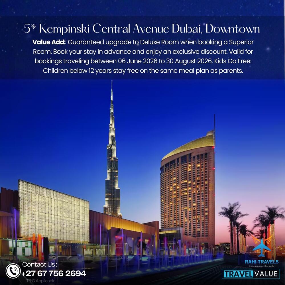 Kempinski Central Avenue Dubai is a 5-star elegant property situated in Downtown Dubai, offering spacious accommodations with direct access to Dubai Mall and close proximity to the Burj Khalifa. Guests benefit from a guaranteed room upgrade when booking a Superior Room, along with an exclusive advance booking discount, valid for select travel dates. A Kids Go Free offer is also available.